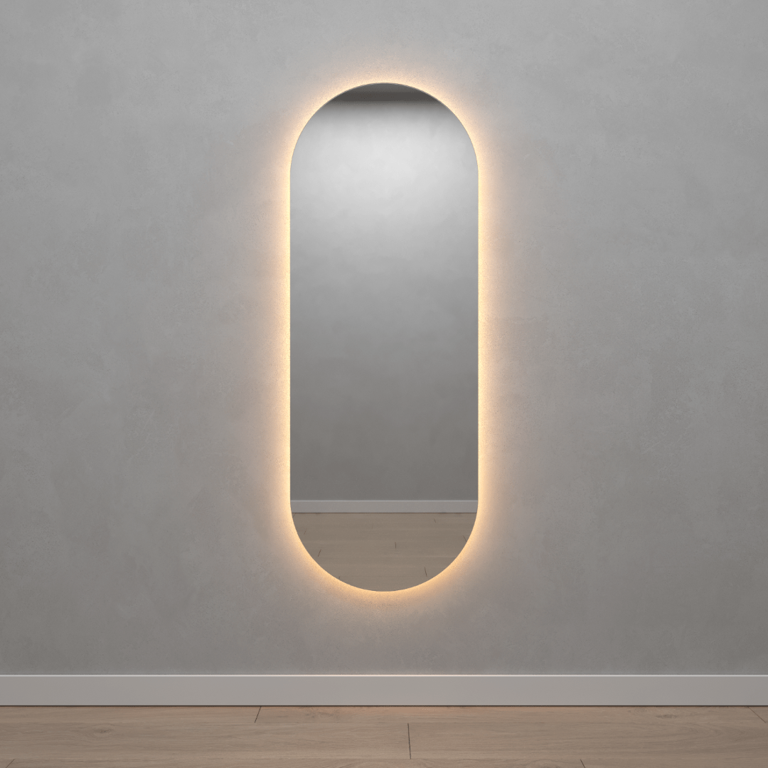 Безрамное зеркало овальной (капсульной) формы с контурной (тыльной) тёплой подсветкой, свет 3000К. Подложка из высококачественного МДФ, светодиодная лента защищена матовым свето-рассеивателем от попадания пыли и влаги. Есть вывод 220W для подключения к сети, включение подсветки от выключателя на стене, либо от розетки.
