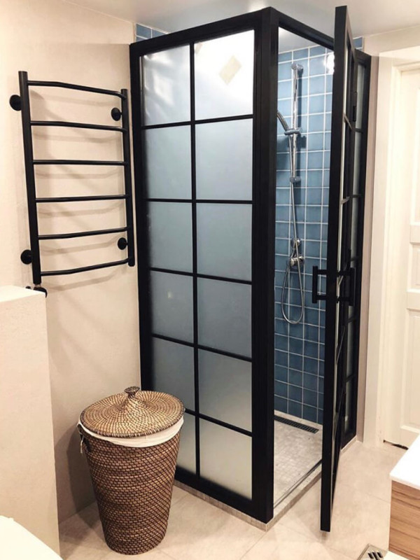 Перегородка для душевой из стали и стекла лишь на первый взгляд – непрактичное решение. Однако, это не так. Благодаря специальным пропиткам и покраске металлический каркас не страдает от воздействия воды и не ржавеет. За стеклом просто ухаживать, достаточно протирать гигроскопичной тряпочкой.